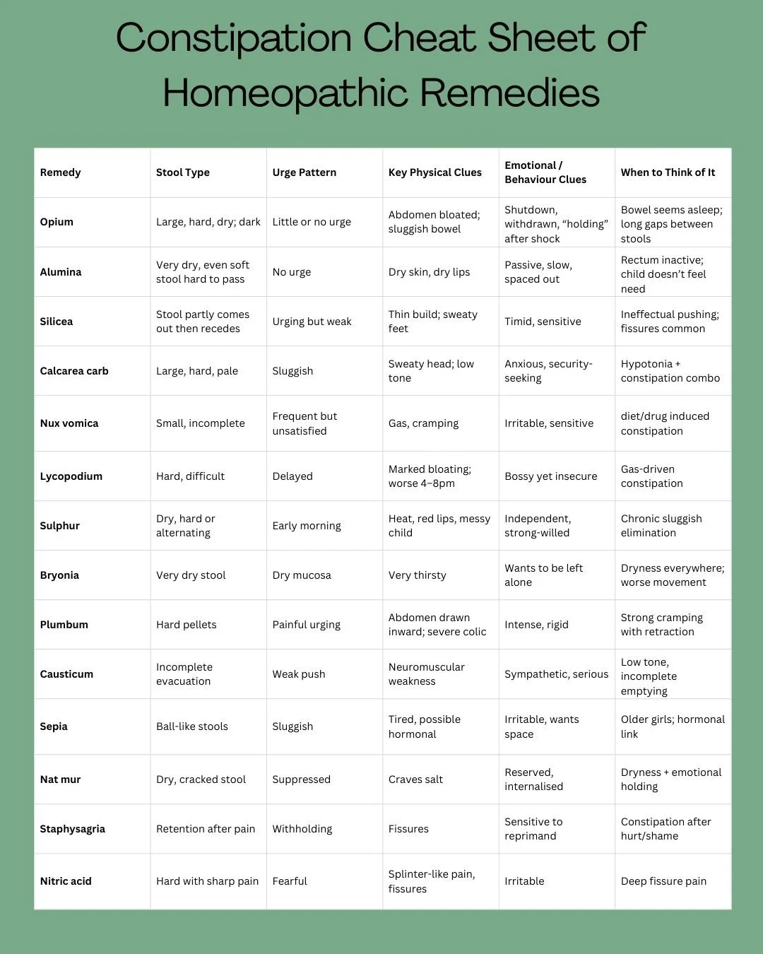 Plumbum – Strong cramping pains with the tummy pulling inward or feeling tightly drawn in. Stool is very hard and difficult to move, often with intense gripping pain before or during passing.